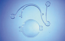 Two basic models are available. For partial iris damage, a ring with one black segment added to it can be implanted to cover the damaged area. For extensive iris damage, a multisegmented ring is available. One should always remember that other noninvasive solutions such as colored contact lenses and tattoos are possible. Ophtec (Groningen, The Netherlands) manufactures iris reconstruction implants as well. PSEUDOPHAKIC INTRAOCULAR LENSES FOR VERY SMALL INCISIONS The advent of microincision surgical techniques rendered cataract removal through clear corneal incisions as small as 1.1 to 1.6 mm possible. The natural consequence of this advance is the development of IOLs that can be inserted through such small incisions. UltraChoice™ ThinLens The UltraChoice™ ThinLens is not available in the United States. ThinOptX (Abingdon, VA) received CE Mark approval for the UltraChoice™ monofocal cataract lens on September 9, 2002. One of the recently developed lenses that can be inserted through a sub–2.0-mm incision (1.45-mm) is the UltraChoice 1.0 Rollable™ ThinLens (ThinOptX) lens (Fig. 60). It is manufactured from a hydrophilic acrylic material with 18% water content. The refractive index of the material is 1.47. The dioptric power of this lens ranges from +15 to +25 D, as of April 2003. The optical thickness is 300 to 450 μm, with a biconvex optical configuration having a meniscus shape. The overall diameter of the lens is 11.2 mm, and the optical diameter is 5.5 mm.