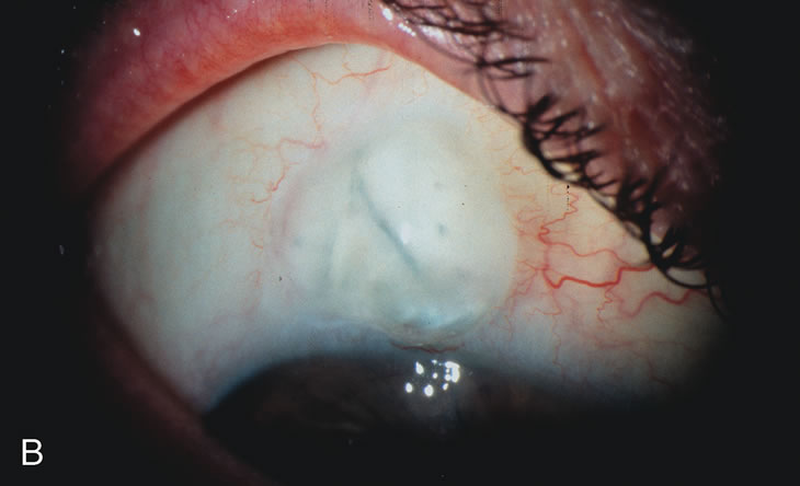 Combined same-site phacotrabeculectomy with MMC lowers IOP more effectively with fewer postoperative medications and larger filtration blebs than without MMC.95–97 MMC also improves the success rate in blacks, eyes of patients on two or more glaucoma medications, eyes with IOP 20 mm Hg or higher, and prior failed trabeculectomy.98,99 Antimetabolite use in combined procedures is associated with a lower postoperative IOP with reduced need for long-term glaucoma medications.100 MMC appears to have a beneficial effect on long-term filtration surgery and on combined surgery without the corneal toxicity of 5-FU.101 However, long-term bleb morphology with MMC is different from that with 5-FU. Excessive concentrations or durations of MMC cause progressive conjunctival necrosis with bleb leaks, hypotony, and possible endophthalmitis. Antimetabolite usage has decreased with trabeculectomy surgery and is reserved for high-risk patients likely to scar down without its usage.