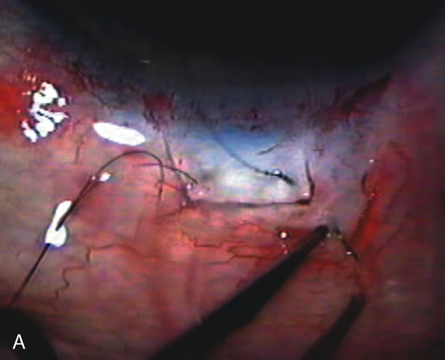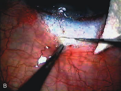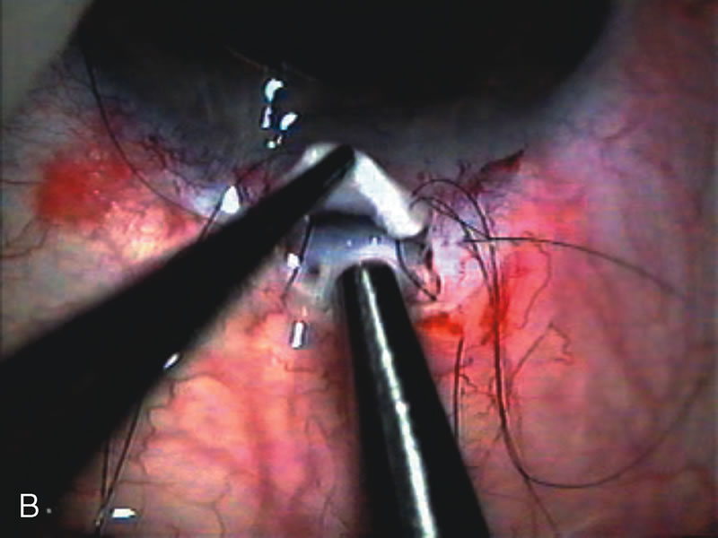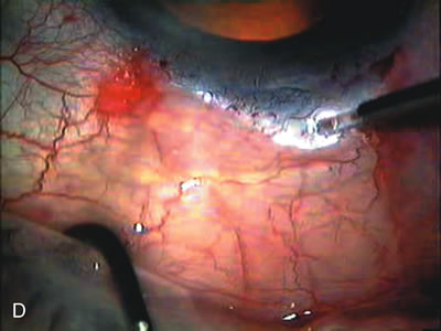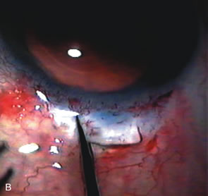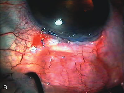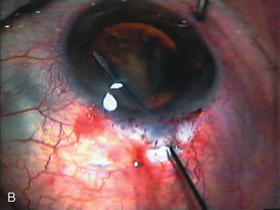 Fig. 2. Wound modulation and revision. A. MMC decreases the likelihood of bleb failure in high-risk eyes undergoing combined cataract and glaucoma surgery. Overusage of this potent cytotoxic drug should be avoided owing to a myriad of problems related to the formation of an avascular bleb. B. Office-based laser revision of the operative wound allows for increased postoperative flexibility with less complications. The correct number and tension of scleral flap sutures allows the surgeon to strive for a safe immediate postoperative IOP range. When fibrosis occurs at approximately 1 week, suturelysis or release of sutures increases filtration while avoiding unwanted hypotony.