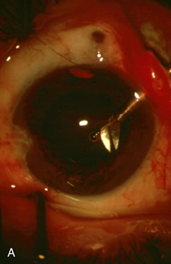 Widespread glaucomatous iris abnormalities include abnormal blood vessel permeability, flaccid iris tone, rigid or atrophic muscles, and friability. The iris of patients with the exfoliation syndrome is extremely tender and easily torn. Pigment dispersion, breakdown of the blood–aqueous barrier, and hyphema at the time of surgery and postoperatively are common in these eyes. The lens capsule and zonules tend to be more fragile in patients with glaucoma than in those without glaucoma.38,39 The problem is most severe in those with the most advanced glaucoma who have been treated most intensively. Surgery is extremely complicated in the exfoliation syndrome because of zonular dehiscence, loose zonules, sticky cortex, and altered blood–aqueous barrier. The lenses of patients with long-standing glaucoma and advanced cataracts are often partially “loose” even though they do not appear frankly dislocated. Long-term parasympathomimetic drug therapy produces leaky iris vessels with breakdown of the blood–aqueous barrier, posterior synechiae, peripheral anterior synechiae, and rigid miotic pupils. Inability to sufficiently dilate the pupil is a leading cause of vitreous loss at the time of cataract surgery. The final outcome of cataract extraction is worsened by preoperative long-term use of para sympathomimetic drugs because the pupil does not dilate well, the iris is more likely to bleed when traumatized, breakdown of the blood–aqueous barrier is excessive,40 and there is an increased likelihood of vitreoretinal interface problems.