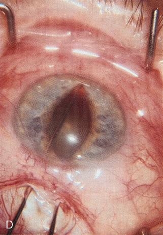 Fig. 1. The anatomic advantage of small incision cataract surgery for the glaucoma patient. A. Long-term bleb function with a large cataract incision is difficult to achieve with either ECCE-trabeculectomy or trabeculectomy followed later by ECCE. This bleb failed to form sufficiently when combined with large incision ECCE. The inflammation, bleeding, and long-term wound healing with stimulation of fibroblasts associated with this technique are more likely to cause bleb failure. In addition, the increased iris manipulation necessary to deliver the nucleus and subsequent iris repair adds to the long-term breakdown of the blood aqueous barrier. B and C. Two-site phacotrabeculectomy has the advantage of small incision cataract surgery combined with separate site trabeculectomy. The incision size is one third the size of the standard ECCE. The inflammation is less severe, and cataract wound healing is confined to the temporal area. Visual rehabilitation with phacoemulsification and foldable IOL is much faster. Phacoemulsification allows successful lens extraction even in the unfriendly environment of a smaller pupil compared with ECCE. The trabeculectomy is performed in an entirely different site, well away from the wound healing associated with temporal phacoemulsification. The likelihood of this filter functioning long-term is greater than with ECCE-trabeculectomy. D. The surgeon also has the option of single-site phacotrabeculectomy with foldable IOL. Both the lens extraction and trabeculectomy are performed through one small 3.5-mm limbal incision.