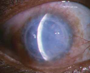 than either granular or macular dystrophy.51,52 Transmission of donor disease to the host may occur and can be serious or even life threatening. Reports in the literature on transplantation of infected donor tissue into previously healthy recipients reveal cases of bacterial endophthalmitis,53–58 fungal endophthalmitis,59–61 fungal keratitis,53 and bacterial keratitis.53 Transmission of rabies to four patients62–64 and Creutzfeldt-Jakob disease to one patient65 have led to the deaths of each of these individuals. Corneal grafts from 5 donors who were not previously known to be harboring HIV have been transplanted into 10 healthy recipients.67–69 Serial antibody testing for HIV has not indicated seroconversion over a period of at least 130 days. All corneal donors are currently tested for hepatitis B and C, syphilis, and HIV infection. Positive tests preclude the use of this donor tissue for transplantation. Infectious crystalline keratopathy is a serious, nonsuppurative, bacterial infection of the graft that may occur in patients maintained on chronic topical corticosteroids. It is caused by several different organisms, with Streptococcus viridans and anaerobic bacteria being the most frequent isolates. Cultures are often negative; therefore, corneal biopsy for histologic examination and microbiologic evaluation is recommended for accurate diagnosis. Epithelial irregularity or haziness secondary to chronic ocular surface disease, such as keratoconjunctivitis sicca or blepharitis, can cause decreased vision and may put the eye at risk for other problems, such as infectious keratitis, corneal melting, and stromal scarring. Fibrous ingrowth, also called retrocorneal membrane, results from the growth of fibrocytes across the posterior aspect of the graft. Epithelial downgrowth resulting from poor wound apposition, iris or vitreous incarceration, or possibly from introduction of epithelial cells into the eye at the time of surgery may also occur and will often present as a posterior corneal line similar in appearance to an endothelial rejection line (Fig. 18).70 Other findings include a fine translucent membrane on the surface of the iris that turns white with argon laser applications, large clumps of cells floating in the anterior chamber that do not resolve with the use of topical corticosteroids, and the rapid onset of severe glaucoma that is refractory to medical treatment. Other causes of increased IOP after penetrating keratoplasty include inflammatory anterior and posterior synechiae, iris incarceration leading to angle closure, mechanical compression of the trabecular meshwork by sutures, malignant glaucoma, corticosteroid-induced glaucoma, and preexisting glaucoma.71,72 Cataract formation or progression results from the surgical insult on normal lenticular physiology as well as from significant intraocular inflammation and chronic use of topical corticosteroids. Vitreous adhesions to the wound in aphakic or pseudophakic eyes may be associated with chronic uveitis and cystoid macular edema. Vitreous traction also increases the risk of a retinal tear or detachment.