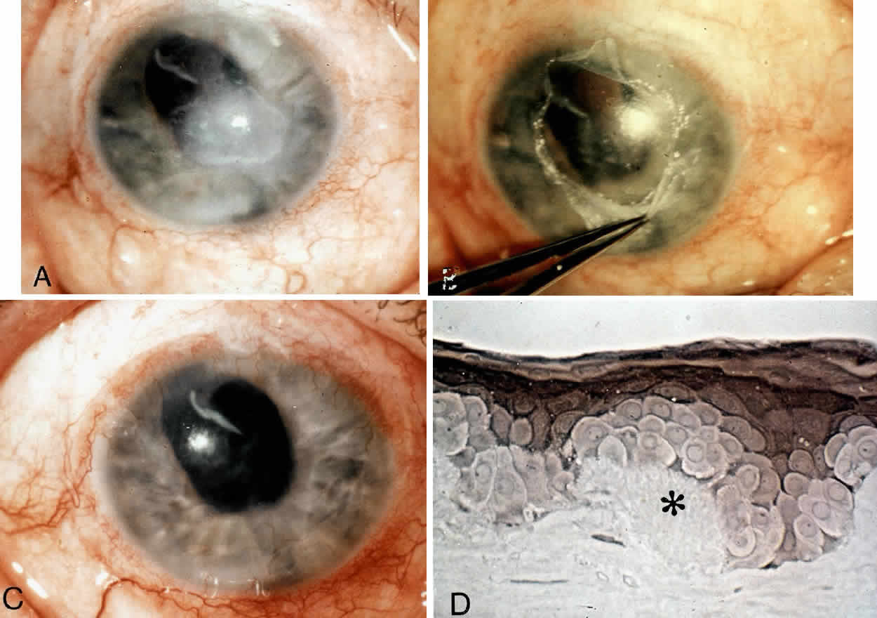 | A variety of corneal dystrophies, degenerations, and injuries have pathologic changes limited to the anterior cornea. More specifically (and as described in the following sections), those conditions affecting the epithelium, subepithelium, and basement membrane regions are particularly amenable to superficial keratectomy. The most common general indications for performing superficial keratectomy include decreased vision from either corneal opacification or irregular astigmatism and/or recurrent erosions not amenable to more conservative therapies. |
