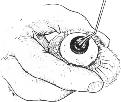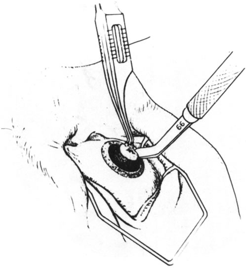 Conjunctival flaps play a less important role in the treatment of perforations than they do in the prevention of progression of corneal melting. Nonetheless, in some leaking descemetoceles and small perforations, conjunctival flaps may serve as a temporizing measure before keratoplasty.14 With the use of tissue adhesives and patch grafting, however, the use of conjunctival flaps for perforation has become almost obsolete. Partial-thickness scleral flaps may be dissected with a base at the limbus and then reflected onto the cornea and sutured in place to treat small peripheral corneal perforations. To be most effective, the epithelium and the necrotic material surrounding the leak must be removed, and dissection of a small lamellar bed is helpful in suturing the sclera to the cornea. This technique is cosmetically less acceptable than the use of corneal material, but it may be of value in emergency situations. Another technique using autologous cornea has been described in which a small trephine (2 mm) was used to dissect a half-thickness peripheral corneal button, which was then sutured in place over a perforation in the cornea of the same eye.15 The donor site healed without complication, and the perforation was repaired as well. An intralamellar flap of cornea folded over the perforation site and then covered with a donor lamellar graft has also been described.16 Amniotic membrane has recently reappeared as a surgical tool and has been used to treat corneal ulceration and perforation. It may be used over fibrin glue to seal perforations17 but is more frequently used alone by filling the corneal defect with multilayered membrane, which is sutured in place and then covered with a larger piece of amniotic membrane with the epithelial surface anterior.18,19 The most frequently used techniques for definitive repair of perforations involve some form of keratoplasty using donor material. The choice between lamellar and full-thickness penetrating keratoplasty depends on a number of factors, including location and size of the perforation, donor tissue availability, and associated ocular findings. My preference is to choose lamellar grafting when the perforation is small and peripheral. Also, when there is marked anterior segment inflammation and a formed chamber, lamellar “patch grafting” may avoid instrumentation of the anterior chamber and the risk of fibrin outpouring, chamber flattening, and formation of synechiae. Lamellar keratoplasty depends on the same principles as the use of tissue adhesive, that is, débridement of necrotic material and removal of surrounding epithelium. Additionally, however, a clean edge for suture placement is necessary and a dry bed is not necessary. The surgery may be done with the use of local or general anesthesia. The use of general anesthesia avoids the increase in orbital and intraocular pressure of a local anesthetic injection and decreases the risk of increasing the fluid leak or causing loss of a formed chamber. Local, especially low-volume peribulbar, anesthesia may work as well in situations in which general anesthesia must be avoided because of systemic illness in the patient. A recent study has shown lack of anesthetic related complications in 140 patients undergoing repair of open globe injuries under local anesthetic with intravenous sedation.20 The technique of surgery is to use a trephine to surround the involved area and, if possible, to cut into the tissue to sufficient depth to create a sharply marginated bed (Figs. 4, 5, and 6). More often, the eye is soft, so the trephine is painted with methylene blue and used to mark the area to be dissected. A sharp blade is then used to further deepen the edges of the bed. The margin of the tissue to be removed is then grasped, and a lamellar dissection of the tissue is carried out toward the center of the perforation. This is usually done with sharp dissection using a lamellar dissecting blade, such as a no. 66 Beaver blade or a crescent-type knife (Fig. 7). The central portion is removed last because the chamber, if not already lost, may flatten at this point (Fig. 8). Once the bed is dissected, the donor is prepared by lamellar splitting from a whole donor eye, dissection from a donor corneoscleral button held in a clamp or artificial anterior chamber, or full-thickness punching from a corneoscleral button. When a whole donor eye is used, the eye is grasped in a gauze pad and a sharp blade is used to incise the cornea at the limbus to the depth needed (Fig. 9). For a 50% lamellar bed, the donor should be dissected to 50% thickness or less. The cornea is then split with a spatula or dissecting blade (Fig. 10) and trephined from the anterior surface (Figs. 11 and 12). Our tendency is to oversize the donor diameter by 0.5 mm for small grafts and 1 mm for larger grafts. For a very deeply dissected recipient bed, a full-thickness donor may be used and punched from the endothelial side.