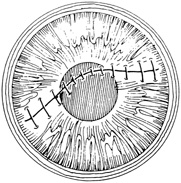 With more complex lacerations, good wound apposition with minimal distortion is the goal. An irregular wound is first subdivided into straight segments with interrupted sutures. Perpendicular areas of the laceration should be sutured before beveled ones to achieve watertight closure with the fewest number of sutures. As suggested by Rowsey and Hays,7 long, deep, and relatively tight peripheral wound sutures in combination with shorter, shallower, appositional sutures near the visual axis may help restore the normal corneal contour by restoring the relatively steep central corneal dome (Fig. 8). For irregular or curvilinear lacerations, all interrupted sutures should be placed perpendicular to the wound, thus avoiding transverse shifting of the wound margins. Although a running shoestring suturing technique may be used with straight lacerations to minimize astigmatism and facilitate subsequent suture removal, a running suture may tend to distort an irregular or curvilinear laceration because it will tend to form a straight line. Thus, if used, running suture bites should be placed perpendicular to and equidistant from an imaginary “regression” line through the wound rather than with respect to the wound itself (Fig. 9).