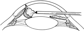 If an avulsed tissue pedicle is seen, it should be carefully replaced into position and sutured into place. Such avulsed tissue is best pulled into place by angling sutures toward the apex of the wound.6 CORNEAL LACERATIONS WITH UVEAL PROLAPSE. Iris incarceration and prolapse are frequently noted conditions that accompany corneal lacerations. A peaked pupil signals tissue incarceration. If prolapsed tissue is present, it must first be carefully examined. Usually, macerated, feathery, devitalized, or depigmented iris should be excised. The prolapsed tissue should be evaluated for any signs of surface epithelialization. In this case, it should be excised to prevent any epithelial cells from proliferating in the anterior chamber. In general, tissue that has been prolapsed for longer than 24 hours should be excised to avoid infection; however, if the tissue appears healthy, it may be replaced with caution. Any tissue to be excised should be gently grasped with fine forceps without applying undue traction. The tissue is then cut flush with the cornea. When excising any tissue, every effort is made to preserve as much as possible to maintain a normal iris diaphragm and conserve tissue for secondary reconstructive efforts.8 Incarcerated tissue will usually require mechanical reposition. Selected cases of mild incarceration may be treated with pharmacologic agents. Agents such as intraocular acetylcholine or carbachol cause pupil constriction, thus pulling iris from the wound. If incarcerated iris is located in the central cornea, mydriatic agents (e.g., intraocular epinephrine 1:10,000) may be used. If mechanical reposition is required, simply deepening the anterior chamber may release incarcerated tissue. Viscoelastic agents may be irrigated through the paracentesis port or the wound adjacent to the involved iris tissue in an attempt to draw the incarcerated iris from the wound (Fig. 12). If unsuccessful, a cyclodialysis spatula or irrigating canula may be passed through the paracentesis site and used to directly sweep incarcerated tissue free (Fig. 13). Care is always taken to avoid trauma to the corneal endothelium, iris, and lens. Any excised tissue should be sent to the pathology department for examination.