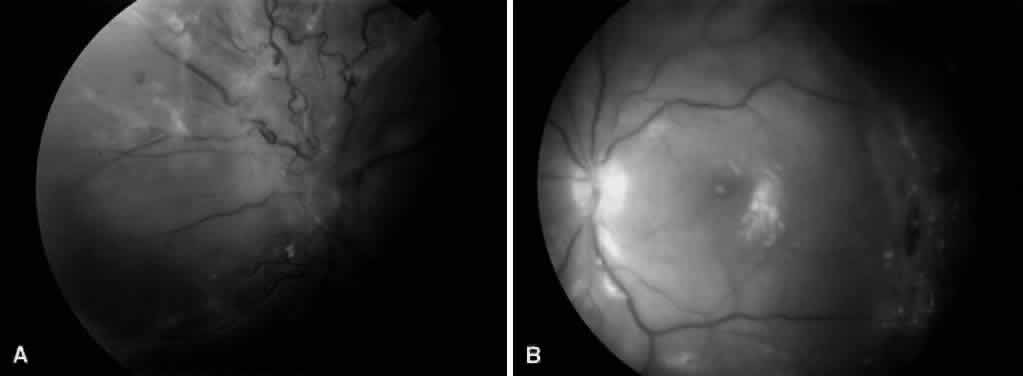 Fig. 5. A. Preoperative fundus photograph of an eye with combined traction-rhegmatogenous retinal detachment from severe proliferative diabetic retinopathy. B. Postoperative fundus photograph of the same eye after vitrectomy, membrane dissection (using delamination technique), and endolaser photocoagulation.