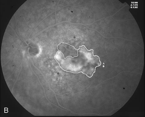Fig. 3. A. Fluorescein angiogram reveals predominantly classic CNV. B. Digital imaging outlines the classic component (A) and the entire lesion (classic and occult, marked as B). The area of classic component measures 7,315 square microns. The entire lesion measures 9,302 square microns. The areas marked with an asterisk correspond clinically to drusen. C. Greatest linear dimension (GLD) of the entire classic CNV measures 4,184 microns.