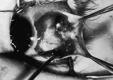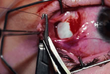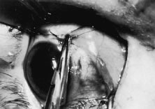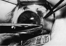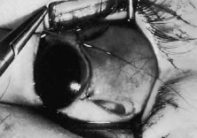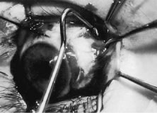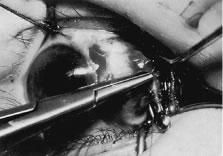Figure 54 shows the conjunctiva being elevated by the assistant with Castroviejo forceps. The anterior extension of the muscle can be seen.