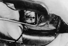 The assistant holds the Castroviejo caliper that marks the location of the new insertion (Fig. 59). Care is taken to locate it directly posterior to the stump of the old insertion and to avoid inadvertent supraplacement or infraplacement of the new insertion.