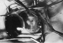 Conjunctival cysts pose more difficult problems.61 These cysts usually form under the conjunctival surface, but some may be carried back with the recessed muscle and rest alongside the muscle or its new insertion (Fig. 81). Cysts occur more frequently after correction of strabismus in patients with strabismus following retinal detachment procedures or re-operations. Cysts do not respond to medical treatment and almost always require surgical excision. In these cases, the surgeon should attempt to remove the entire cyst structure or to marsupialize it if complete removal is impossible.