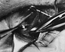 Step 1. With the eye depressed and adducted by the assistant, a superior-temporal, two-plane fornix incision is made approximately 8 mm posterior to the limbus. It is important to keep the incision parallel to the upper lid so that the upper lid will cover the closed wound at the end of the procedure.