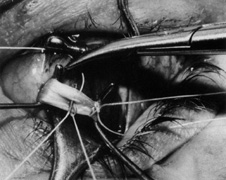 Fig. 1. The lateral rectus muscle is isolated through a limbal incision and dissected free of intermuscular septum and check ligaments for a distance of approximately 15 mm posterior to its insertion.