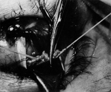 Step 10. All instruments are removed from the eye and standard forced duction testing is performed. If the superior oblique restriction has not been relieved, the sutures can be replaced with a longer measured segment of suture in the same manner.