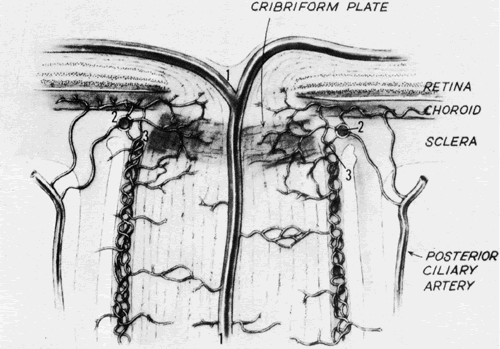 Fig. 4. Blood supply of the optic nervehead. 1, central retinal artery; 2, arterial circle of Zinn-Haller; 3, pial arterial network. Contribution to Zinn-Haller circle from posterior ciliary arteries, pial plexus, and peripapillary choroid. The latter also sends branches directly to prelaminar disc substance. (Modified from Kolker AE, Hetherington J Jr: Becker-Shaffer's Diagnosis and Therapy of the Glaucomas, 3rd ed. St. Louis, C.V. Mosby, 1970)