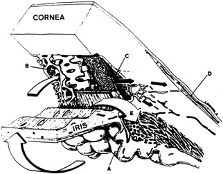 Fig. 1. Cross section through the anterior segment of the eye illustrating the chamber angle. Aqueous humor is formed by active secretion from the ciliary processes (A). Drainage occurs via the outflow pathways, principally the trabecular meshwork (B) and Schlemm's canal (C) into the aqueous veins (D). A smaller proportion of the aqueous humor makes its way directly into the ciliary body (uveoscleral pathway) and is drained by way of the ciliary muscle, the suprachoroidal space, and the sclera (E). (From Karnezis TA, Murphy MB: Dopamine receptors and intraocular pressure. Trends Pharmacol Sci 9:389–390, 1988, with permission.)