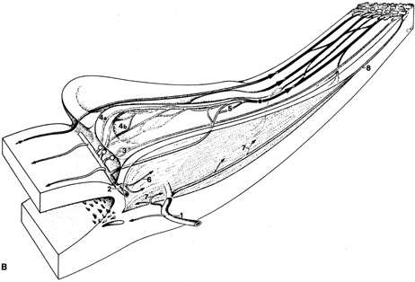 Fig. 3. A: Blood supply to the ciliary processes. LCM, longitudinal ciliary muscle; RCM, radial ciliary muscle; CCM, circular ciliary muscle. B: Vascular architecture in the human ciliary body. (1), Perforating branches of the anterior ciliary arteries; (2), major arterial circle of the iris; (3), first vascular territory. The second vascular territory is depicted in 4a, marginal route and 4b, capillary network in the center of this territory. (5), third vascular territory; (6 and 7), arterioles to the ciliary muscle; (8) recurrent choroidal arteries. Light circles, terminal arterioles; dark circle, efferent venous segment. (A, From Caprioli J: The ciliary epithelia and aqueous humor. In Hart M, ed.: Adler's Physiology of the Eye, 9th ed. St. Louis: Mosby Year-Book, 1992:228–247, with permission; B, From Funk R, Rohen JW: Scanning electron microscopic study on the vasculature of the human anterior eye segment, especially with respect to the ciliary processes. Exp Eye Res 51:651, 1990, with permission.)
