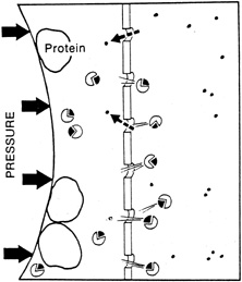Fig. 6. Ultrafiltration. This process is similar to dialysis, but with the addition of a hydrostatic pressure that increases the rate of net movement of water and salt molecules across the semipermeable membrane. The final equilibrium concentrations on either side of the membrane are the same as in dialysis. The hydrostatic pressure merely increases the rate at which equilibrium is achieved. (Courtesy of RL Stamper, MD.)
