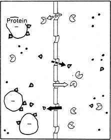 Fig. 7. Gibbs-Donnan effect. Because protein molecules carry an overall electrical charge (usually negative) at physiological pH, the distribution of ions at equilibrium is altered slightly to reflect the tendency of the protein molecules to attract oppositely charged and repel like-charged ions. Therefore there is a higher concentration of cations on the protein side and a higher concentration of anions on the nonprotein side of the system. (Courtesy of RL Stamper, MD.)