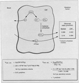 The uncatalyzed rate is found experimentally by inhibiting the enzyme in vivo by a large dose of acetazolamide or similar compound. Such inhibition, when complete, should yield the uncatalyzed rate of HCO3 formation. Measurements obtained experimentally indicate that the observed inhibited rate (Fig. 9; 0.024 μmol/min) is not different from the calculated uncatalyzed rate of 0.07 μmol/min. Considering the assumptions about pH and cell volume, the difference between the calculated and experimentally measured inhibited rates of bicarbonate flow lies within acceptable limits of error. Inhibition of the flow of bicarbonate also leads to an inhibition of the flow of Na+. Several hypotheses have been put forward to explain this: (i) inhibition of carbonic anhydrase causes a decrease in HCO3 available for movement with Na+ to the aqueous side to maintain electroneutrality; (ii) a reduction in intracellular pH may inhibit Na+-K+ ATPase; and (iii) decreased availability of H+ produced by the reaction catalyzed by carbonic anhydrase decreases H+/Na+ exchange and reduces the availability of intracellular Na+ for transport into the intercellular channel.