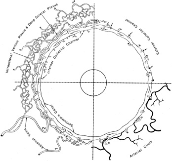Other aspects of the anatomy and physiology of aqueous drainage were discovered subsequently. Boerhaave first described the presence of the aqueous veins,17 and Ascher18 observed a clear fluid in veins of the episclera and demonstrated by means of external compression with a glass rod that these veins were interconnected with veins containing blood. Goldmann19 demonstrated that these vessels contained aqueous humor by injecting fluorescein intravenously and observing the dye entering the anterior chamber and subsequently the aqueous veins. Ashton20 identified an aqueous vein in a living human eye, and postmortem examination using a neoprene cast showed that there was a direct passage between the vessel and Schlemm's canal.