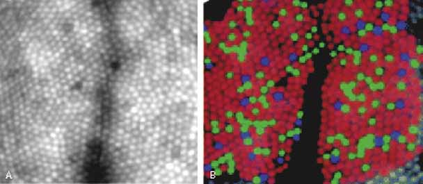 CONES AND CONE ARRAYS The principle of univariance states that information about a photon's energy or wavelength is lost once it is absorbed by a photopigment molecule.10 This crucial fact means that each cone is color blind. In other words, an individual cone can signal an increase or decrease in activity but it cannot distinguish whether the change in activity results from a wavelength shift or an intensity change. How then can an array of color-blind receptors provide information about the wavelength content of a stimulus? The answer is that each of the three cone types has a different response to the stimulus because of its spectral sensitivity, and by comparing the outputs from different cone types, a second-order neuron can separate out a change in wavelength from a change in intensity. For example, at constant luminance, a wavelength shift from 500 nm (green) to 490 nm (blue) will increase stimulation of S cones while decreasing stimulation of M and L cones. If the S, M, and L signals are compared, the direction of the wavelength shift can be discerned. However, an intensity change of a 500 nm light will increase (or decrease) the stimulation of all three cone types. Therefore, comparing outputs from cones or arrays of cones is essential for color vision. M and L cones are morphologically indistinguishable, and they comprise more than 90% of all cones. S cones, however, tend to be fatter than the other cone types, particularly in the region of the inner segment, and they make up less than 10% of the 5 million cones in a human eye.11. There are approximately twice as many L cones as M cones, although individual variation occurs within the color normal population.12,13 Overall, the ratio of S:M:L is approximately 1:5:10. S cones are absent from the central 20 minutes of arc of the central foveola. This S–cone-free zone corresponds to the size of a 20/80 letter. The S cones do not contribute to detailed visual resolution, and their absence from this small central region allows optimal L and M cone packing, thereby maximizing spatial sampling.14 The consequence to color vision is that color normals are tritanopic for very small stimuli centered on the fovea. The density of S cones is greatest at 1 to 2 degrees from the fovea. Figure 5 shows the cone distributions and the S cone mosaic in a donor human eye. The density of L and M cones declines steeply away from the fovea. Although overall cone density is by far greatest at the fovea, cones are present across the entire retina. Recently adaptive optics has allowed direct visualization of the human cone mosaic. The technique compensates for aberrations of the eye, allowing previously unattainable spatial resolution. Combined with selective bleaching (using colored lights to differentially bleach cone populations) the mosaic of S, M, and L cones has been revealed.13 Figure 6a shows an image of the retina centered close to the fovea. Figure 6b shows a pseudo color image in which individual S, M, and L cones are colored blue, green, and red. Statistical analysis reveals that in humans S, M, and L cones appear randomly distributed 15.