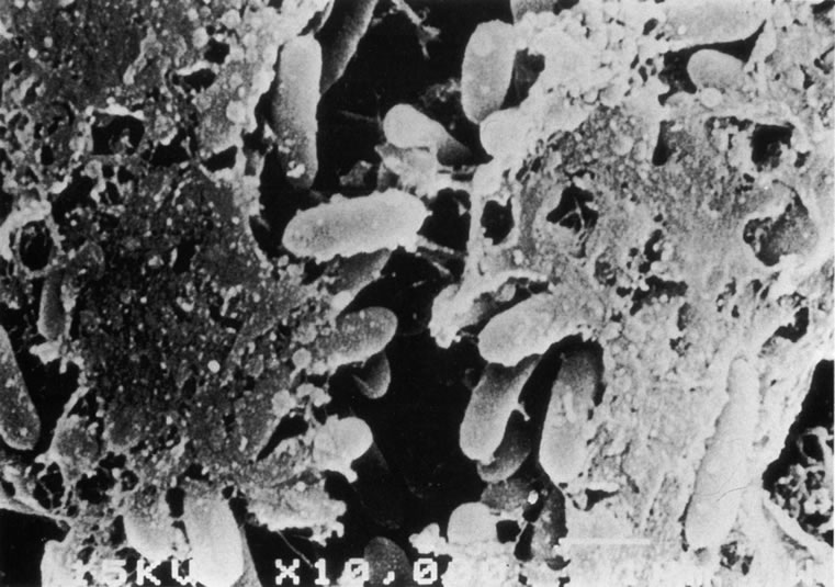 PATHOGENESIS OF MICROBIAL KERATITIS IN CONTACT LENS USERS The epidemiological studies described previously identified several factors that contribute to the pathogenesis of keratitis in CL users: overnight wear, soft lenses, poor hygiene compliance, and certain hygiene systems. However, epidemiologic studies themselves cannot determine the pathogenesis of disease. This section integrates the epidemiologic data with the clinical and laboratory investigations that have led to our current understanding of the pathogenesis of corneal invasion by bacteria and Acanthamoeba in CL users; the pathogenesis of inflammation and corneal destruction by these organisms is described in other chapters. Until recently, theories of the pathogenesis of MK in CL users were founded on two principal proposals. First, CL wear, particularly the use of EW SCLs, has extensive effects on the ocular surface129 that might be expected to compromise its resistance to microbial invasion.71,74,130 Second, some of these eyes are exposed to large numbers of bacteria that contaminate a high proportion of CL cases.131,132 The combination of increased susceptibility to infection and increased exposure therefore results in an increased risk of infection. Poor understanding of the pathogenesis of infection in CL users and of the mechanisms underlying these two proposals contributed to both the exacerbation and the perpetuation of the problem of MK in CL wear. An example of a solution is the introduction of extended wear, both reusable and disposable, as a means of reducing exposure to contaminated CL solutions. In addition, these proposals do not address the questions of why Pseudomonas and Acanthamoeba are more common than other organisms in CL users with keratitis, why there is no link between CL case contamination and keratitis in all patients with keratitis,3,133 and why RCL users are probably at a lower risk for keratitis than SCL users. Some of these observations have now been investigated, contributing to the development of a theory for the pathogenesis of MK in CL users. The following contributory factors must be addressed for both bacterial and amoebic keratitis: Source of the organisms BACTERIAL KERATITIS Source of Bacteria All of the organisms that commonly cause keratitis in CL users may be isolated from the ocular surface of normal individuals. These include S. aureus, Pseudomonas aeruginosa, and other coliform bacteria.134 These organisms derive from several sources. S. aureus is a widespread human pathogen that is frequently commensal in the nose. P. aeruginosa is a ubiquitous organism in our environment, common in soil, on vegetation, in water, and in the human gut and upper respiratory tract.135 It has also been found to contaminate cosmetics as well as CL care solutions.136 Studies of the conjunctival flora in CL users have shown no qualitative change in the short term, and the numbers of bacteria may be reduced compared to controls (see section on conjunctivitis). However, one study has related conjunctival cultures to contamination by gram-negative flora from contaminated CL cases.22 These have since been shown to be an important additional source of pathogens.136–139 The importance of contamination of CL cases in the pathogenesis of bacterial keratitis in CL users has been known for many years, and the expected link between CL case contamination and keratitis has been confirmed in some studies,131 although an association is not always present.133 CL case contamination probably results from a combination of poor hygiene pracitces and the failure of current disinfection systems in use. The role of the CL case may be to amplify the concentration of the environmental bacteria contaminating the case, thus providing a large inoculum of microorganisms presented to the eye by the CL. The discovery of the potential importance of the bacterial glycocalyx (described later), provides a theoretical mechanism whereby small numbers of bacteria from these environmental sources might be able to amplify in large numbers, both in the CL case and on the CL surface itself.137 The Role of Bacterial Adherence BACTERIAL ADHERENCE MECHANISMS. If the contact lens is to act as a vector for bacteria, these must at first adhere to the lens surface. This requires that the bacteria reach the surface, either by fluid or airborne mechanisms. Attraction or repulsion occurs due to the sum of the Van der Waals forces and the electrostatic forces. This is mainly a function of the distance of the bacteria from the surface. These interactions of total Gibbs energies are described by the Derjaguin-Landau and Verwey-Overbeek (DLVO) theory.140 The net result is usually repulsion, but temporary adhesion may occur. This can be broken by mechanical forces or bacterial mobility.141 For a surface bathed in fluid, such as a contact lens, these forces become dependent on the concentration of solutes in the solution. Repulsive electrostatic forces are less effective as ionic strength is increased. They are also influenced by the size of the bacteria and the surface hydrophobicity. Hydrophobic bonding has been shown to be important on many acellular surfaces, outweighing the effect of surface charge, and the degree of adherence may be related to it.142–144 Specific lectin-like bonding, probably mediated by adhesins on bacterial pili, is probably more important in mediating adherence at mucosal surfaces than at acellular surfaces,144 although corneal infection may be caused by non-piliated strains.145 However, lectin-like bonding may be an important factor on lens surfaces covered in ocular deposits, including mucin, which contains sialic acid to which specific Pseudomonas receptors have been demonstrated.146 BACTERIAL ADHERENCE TO CONTACT LENSES. Numerous studies have been carried out on bacterial adherence to contact lenses to explore the potential for adherent bacteria to cause keratitis. These studies have shown several inconsistencies. Both P. aerug
