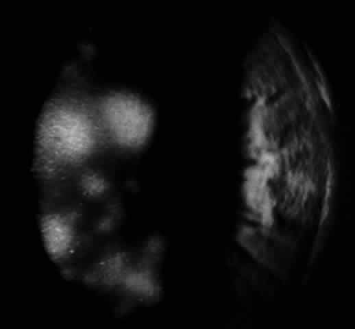 CONJUNCTIVA AND CORNEA There is increasing clinical and laboratory evidence suggesting that EBV is capable of infectingsusceptible cells in the ocular surface epithelia. Expression of CD21, the putative EBV receptor, has been detected in conjunctival and corneal epithelial cells.65 EBV genomic sequences have been detected in 10% of normal corneal epithelial specimens.30 Using highly sensitive reverse transcriptase PCR, EBNA-1 mRNA sequences, but not active latent or lytic cycle associated gene sequences, were detected in 95% of human conjunctival epithelial specimens obtained by impression cytology.31 Taken together, these results suggest that the ocular surface epithelia are sites of EBV persistence following primary infection. Numerous cases of conjunctivitis occuring in patients with IM syndrome were reported prior to the availability of specific tests to confirm a clinical diagnosis of IM.66 More recently, conjunctival involvement has been reported in patients with serologically confirmed IM. In 1981, Meisler and associates reported a case of a unilateral conjunctival inflammatory mass and enlarged preauricular lymph node in an 11-year-old boy with acute IM.67 The conjunctival lesion was biopsied, and an intense lymphocytic infiltrate with occasional multinucleated giant cells was observed in histologic sections. Wilhelmus reported a case of unilateral keratoconjunctivitis in a 16-year-old girl with acute IM.68 This patient had a follicular conjunctivitis and preauricular lymph node. Virus was cultured from the tears and conjunctiva of this patient. Matoba and associates also noted conjunctival inflammation consisting of mild hyperemia occasionally accompanied by a follicular tarsal conjunctival response in a series of patients with IM.69 Gardner and co-workers recently reported a case of a bulbar conjunctival nodule associated with unilateral enlarged preauricular and submandibular lymph nodes in a 38-year-old patient with acute IM. Mature lymphocytes and plasma cells were noted in histologic section, and scattered cells in the lesion stained positively for EBV active latent cycle antigens (LMP-1 and EBNA-2).70 The first reported association between IM and keratitis came from Payrau and Hoel in 1958.71 The authors described a patient with IM, follicular conjunctivitis, and in a single quadrant of one cornea, interstitial infiltrative keratitis. However, theputative association between IM and corneal stromal inflammation in their case is in doubt, because they also found a corneal foreign body within the area of keratitis. In 1980, Pinnolis and colleagues described a 16-year-old boy with classical heterophil antibody-positive (IM) who, upon discontinuation of oral corticosteroids, developed bilateral “nummular interstitial keratitis” without stromal vascularization.72 The corneal opacities were bilateral and symmetric unlike herpes simplex (HSV) and varicella-zoster virus-induced disease, and deeper within the corneal stroma than the subepithelial infiltrates of adenovirus keratitis. Acute and convalescent serologies by indirect immunofluorescence for specific antibody against EBV capsid antigen showed a greater than fourfold rise consistent with acute infection, while antibody titers by complement fixation for HSV, adenovirus, mumps, cytomegalovirus, influenza virus, and respiratory syncytial virus remained low or undetectable throughout the illness. In 1986, Matoba and associates reported 7 patients with purported EBV stromal keratitis, but only 3 of the patients had clinical symptoms of IM or evidence of recent seroconversion.69 In one of the patients, heterophil antibody-positive IM preceded by 1 week the onset of chronic multifocal keratitis. When the authors first examined the patient in referral 9 months later, they found multiple, discrete, anterior stromal opacities in the patient's left eye. In another patient, bilateral, patchy, deep peripheral infiltrative keratitis and a fourfold decrease in antibody against EBV viral capsid antigen were documented at the time of referral 5 months after an “infectious mononucleosis-like illness” associated with bilateral red eyes and photophobia. In another patient, the authors state that IM preceded subepithelial infiltrative keratitis in the left eye by 1 month. When examined 8 months after onset of the keratitis, the patient's left cornea showed features of multifocal anterior stromal and deep peripheral stromal keratitis. Although the other 4 patients in this series did not show evidence of recent EBV seroconversion, their keratitis appeared similar to that of the patients with documented IM. On clinical grounds alone, Matoba and associates postulated that the development of EBV keratitis did not depend on recent EBV infection, but could occur in the chronic carrier state. To summarize the authors' findings in the combined group of 7 patients, the interstitial keratitis appeared in 4 patients as unilateral, multifocal, discrete, sharply demarcated, anterior stromal opacities, 0.1 to 2 mm in diameter, with either a blotchy pleomorphic (Fig. 2) or granular ringlike appearance (Fig. 3), in two patients as bilateral, multifocal, full-thickness or deep stromal peripheral infiltrates reminescent of luetic keratitis (Fig. 4), and in 1 patient with features of both. No patient tested had showed serologic evidence of acute systemic HSV or adenovirus infection. Both patients with keratitis restricted to the peripheral cornea had bilateral disease but lacked serologic evidence for syphilis (nonreactive MHA-TP). Five patients had mild or moderate corneal stromal vascularization. Two patients showed corneal epithelial granularity overlying the stromal opacities.