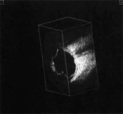 for imaging the anterior segment. Clinical diagnostic forms of ultrasound are based on physical principles of pulse-echo technology and tissue acoustic impedance mismatch. Pulse-echo technology employs synthetic crystal transducers to produce ultrasonic wavefront pulses and retrieve echoes for electronic display and processing. Send-receive sequences are repeated thousands of times each second. Echoes are generated at adjoining tissue interfaces that display differences in acoustic impedance: the greater the difference, the stronger the echo. Retinal tissue, for example, is sonically much different than vitreous (which is essentially water). Therefore, strong reflections occur at such interfaces. When adjoining tissues have relatively small differences in acoustic impedance, as with mild vitreous hemorrhages or clumped intravitreal cells, small or weak reflections are seen. Similar interpretation principles are useful in evaluating types of ocular and orbital tumor tissue. Some lesions demonstrate low-amplitude internal reflectivity; few echoes are seen, and such lesions are described as ultrasonically homogeneous. In contrast, others demonstrate high-amplitude internal reflections; multiple strong retinal echoes are seen, and these lesions are described as ultrasonically heterogeneous. Either tissue type may in addition shadow deeper structures by absorbing or reflecting sonic energy. The presence or degree of shadowing often aids interpretation of ocular and orbital lesions by demonstrating sonic attenuation. Once reflected, echoes are received, amplified, and electronically processed. They are displayed in visual format as A-scan or B-scan images. A-scan (A-mode or time-amplitude) ultrasonography is used predominantly for tissue characterization and interpretation. The horizontal axis of this display represents time or distance and is useful for linear measurements, whereas the vertical dimension reveals echo amplitude and is useful for characterizing tissues (Fig. 1). A-scan may be performed independently of B-scan. B-scan (B-mode or intensity-modulated) ultrasonography provides a cross-sectional image of the globe and orbit (Fig. 2). B-scans are used predominantly for topographic information. There are overlaps of information from A-scan and B-scan; most physicians rely on both forms for adequate ultrasound interpretation, and instruments are available that present B-scan and A-scan images simultaneously (Fig. 3). The display images are presented horizontally in contact scanning and vertically with waterbath (immersion) scanning6–8 (Fig. 4).