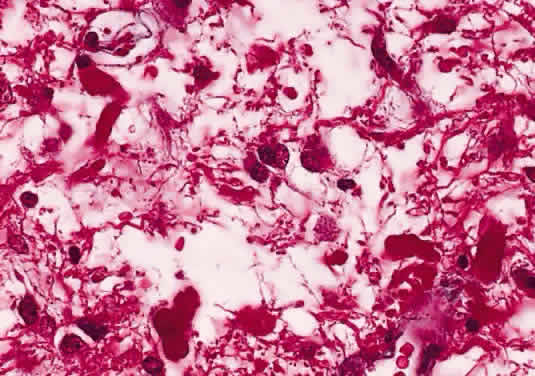 Two histologic features that are present in nearly every example of pilocytic astrocytoma are Rosenthal fibers and eosinophilic granular bodies. Rosenthal fibers are enlarged, brightly eosinophilic cell processes that are sausage or corkscrew-shaped. On Masson trichrome staining, they are bright red (Fig. 38). Ultrastructurally, Rosenthal fibers are defined by amorphous aggregates of electron-dense material within the nerve processes. The number of Rosenthal fibers in different tumors and even within an individual tumor varies considerably; rarely, they are absent entirely. Granular bodies, as the name suggests, consist of rounded eosinophilic proteinaceous structures (Fig. 39). Neither Rosenthal fibers nor granular bodies are unique to pilocytic astrocytomas and are commonly seen in other low-grade astrocytic neoplasms (e.g., ganglioglioma). Their presence, however, essentially excludes a high-grade glioma.