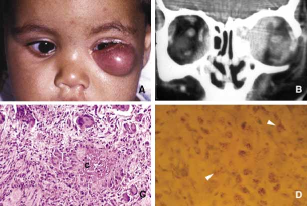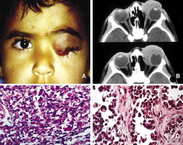 Patients with metastatic orbital tumors most frequently present with rapidly developing unilateral motility disturbance, painful proptosis, and, occasionally, a palpable mass.300,301 Imaging studies with CT and MRI provide information regarding the location of the tumor and the pattern of orbital involvement; however, they rarely offer any clues in terms of the primary site.302,303 Fine-needle aspiration biopsy (FNAB) is an effective method for histopathologic confirmation of orbital metastasis.304,305 In experienced hands, an adequate specimen is often obtained to provide material for routine, as well as special studies and the specimens should be evaluated by an experienced cytopathologist, knowledgeable in orbital diseases.306 False-negative results may be seen in tumors with prominent fibrous stromal reaction or hemorrhage, as well as in neoplasms that are surrounded with marked inflammatory response.307,308 Carcinoid tumors in the orbit may be primary or metastatic; the latter is reported to be a slowly growing circumscribed tumor with a long survival after surgical treatment.309,310 In approximately 10% of metastatic orbital tumors, the site of the primary lesion is unknown. This is a condition that is known as occult primary malignancy, in which the pathologist may play a pivotal role to identify the site of the primary neoplasm. For this purpose histochemical and immunohistochemical studies, polymerase chain reaction, chromosomal analysis, flow cytometry, and electromicroscopy may provide useful information in addition to the routine histopathological evaluation. In children, metastatic neoplasms to the orbit are predominated by small, round, blue-cell tumors, including neuroblastoma, Ewing sarcoma, granulocytic sarcoma, and Wilms tumor.311 Neuroblastoma is the commonest malignant tumor of infants, with an approximate incidence of 1 per 1000 live births, and it is the most common metastatic tumor to the orbit in this age group. Neuroblastoma is most often seen during the first year of life. As a matter of fact, it is the most common congenital neoplasm, which may be widely metastatic at birth, characteristically producing multiple subcutaneous and periocular metastatic lesions with ecchymosis (“blueberry muffin baby”).312 This tumor originates from primitive sympathicoblasts that normally would differentiate into ganglion cells. Microscopically it is made of round or oval, small round lymphocyte-like cells with hyperchromatic nuclei and minimal cytoplasm containing numerous mitotic figures (Fig. 33). Differentiating neuroblasts, ganglion cells, as well as rosette formations (Homer-Wright rosettes) may be seen in primary tumors. Once the tumor metastasizes, however, the features of neural differentiation are lost and it usually presents in the orbit with sheets of small, rounded cells.313 In these cases, ancillary techniques of histochemistry and immunohistochemistry may become valuable. Immunohistochemically, neuron-specific enolase (NSE) and S-100 neurofilament (NF) proteins are useful markers for neuroblastoma. Approximately 75% of the affected children excrete increased amounts of catacholomine byproducts, including vanillylmandelic acid (VNA), norepinephrine, homovanillic acid (HVA), and dopamine in the urine; this is very helpful in diagnosis. SECONDARY TUMORS Tumors extending or infiltrating into the orbit range from congenital malformations, hamartomatous and teratomatous lesions and reactive proliferations to highly malignant neoplasms such as retinoblastoma. The incidence of these lesions varies according to the definition of “tumors,” but they constitute approximately 10% of all orbital space-occupying lesions.314 Secondary orbital tumors may originate from the cranial bones and central nervous system tissues (meningioma, pituitary adenoma, craniopharyngioma),108,200,315,316 periorbital bones (osteoma and osteogenic sarcoma, giant cell-rich reactive lesions),276,277 paranasal sinuses and nasal cavity (squamous cell carcinoma),317 naso-lacrimal drainage apparatus (squamous cell carcinoma),318,319 globe, (uveal melanoma, retinoblastoma),320,321 (Fig. 34) and conjunctiva and the eyelids (squamous cell carcinoma, basal cell carcinoma, melanoma, and sebaceous gland carcinoma)314,320 (Fig. 35). As one can imagine, not only the histopathological features but also the clinical and radiologic manifestations vary, depending on the site of origin in the aforementioned secondary orbital tumors. | |||||||||||||||||||||||||||||||||||||||||||||||||||||||||||||||||||||||||||||||||||||||||||||||||||||||||||||||||||||||||||||||||||||||||||||||||||||||||||||||||||||||||||||||||||||||||||||||||||||||||||||||||||||||||||||||||||||