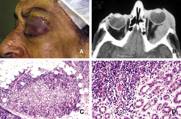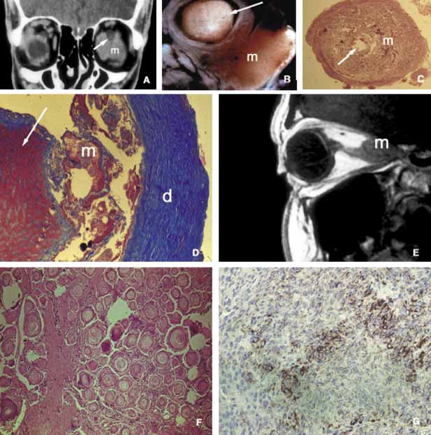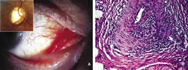 MICROBIAL INFLAMMATION Microbial infections of the orbit develop because of a variety of organisms, which are introduced to the orbit by different routes. Bacterial orbital infections are the most common that primarily originate from the paranasal sinuses and to a lesser degree, secondary to penetrating injuries with or without foreign bodies and rarely, secondary to endophthalmitis or systemic infectious process such as bacterial septicemia, tuberculosis, etc. The most common cause of bacterial orbital cellulitis is Staphylocci and Streptococci species. Although Haemophilus influenza was a common causative organism in children younger than 4 years of age, recent vaccination efforts have decreased the incidence of H. influenza cellulitis significantly.55 Anatomically speaking, if the infection is limited to anterior of the orbital septum, involving the eyelids it manifests itself primarily with lid and conjunctival edema and some venous congestion but not with proptosis.56 This process that is known as preseptal cellulitis is usually initiated with skin injuries or an upper respiratory tract infections in children. However, if the infectious process involves orbital soft tissues behind the septum, it is called orbital cellulitis (Fig. 6). Cellulitis usually develops secondary to a paranasal sinus disease, clinically associated with axial proptosis, marked chemosis, congestion of retinal veins, limitation of extraocular motility, and swelling and pain around the eye. Depending on the severity of the condition, vital structures within the orbit such as the globe and the optic nerve may be compressed or infiltrated by the infection. Generally, in children the orbital cellulitis originates from the ethmoid sinus and may limit itself to the subperiosteal site for a while and later spread into orbital soft tissues. Acute bacterial orbital cellulitis presents a nonspecific histopathology associated with diffuse polymorphonuclear infiltrate that may on occasion lead to abscess formation57 (Table 2). Subperiosteal and soft tissue abscesses may present with decreased vision, disc edema and increased intraorbital and intraocular pressures. Orbital abscess is best demonstrated with MRI. Emergent orbital exploration and the drainage of the abscess is indicated.