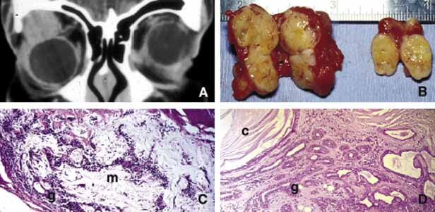 Many metastatic neoplasms originating from other organ systems may find their way to the orbit by hematogenous spread. The most common metastatic malignancies include breast, lung and kidney carcinomas, cutaneous melanoma and rarely sarcomas originating elsewhere in the body.160–162 Tumor-like conditions such as pseudotumors, granulomas, congenital lesions (hamartomas, choriostomas, etc.) that may also invade orbit secondarily are covered elsewhere in this chapter. Both the clinician who evaluates the patient with an orbital space occupying lesion and the pathologist who examines the tissue removed from an orbital mass, must have a working knowledge of the frequency of orbital neoplasms and tumor-like conditions163–166 (Table 4). More commonly encountered acquired orbital neoplasms are detailed. PRIMARY TUMORS Epithelial Neoplasms Primary epithelial neoplasms of the orbit originate from the ductal and acinar epithelium of the lacrimal gland.167,168 The most commonly encountered lacrimal gland tumor is pleomorphic adenoma (benign mixed tumor) (BMT). This neoplasm is known as a “mixed” tumor because it is composed of a mixture of epithelial and stromal elements (Fig. 14). The epithelial elements of the tumor consist of glandular and ductal formations that may develop squamous metaplasia and small keratin filled cysts. The stroma is composed of myxoid tissue that may contain cartilage and bone. In most cases the BMT of the lacrimal gland is multilobulated and surrounded by a fibrous capsule. If additional smaller lobules are present in the vicinity of the main lesion, these satellite nodules are individually encapsulated as well. When malignancy develops within a BMT it is classified according to its predominant histopathologic component as adenocarcinoma within pleomorphic adenoma, adenoid cystic carcinoma, or poorly differentiated carcinoma. Malignant transformation may happen as a rapid growth within an unknown tumor or may take place decades after diagnosis of the BMT.169 Adenoid cystic carcinoma, the most common malignant tumor of the lacrimal gland may also develop de novo. This is a highly malignant neoplasm that can be seen in adolescents and may develop rapid extension into the adjacent structures including the cranium by direct invasion and to the base of the skull by painful perineural invasion.170,171 The histopathologic appearance of adenoid cystic carcinoma may present as several variants including the most common “Swiss cheese” pattern that consists of cribriform clustering of small basophilic tumor cells surounded by thick basement membrane (Fig. 15). Other types including diffuse basaloid, sclerosing, tubular, and comedocarcinoma are known to exist.172 Both benign and malignant tumors of the lacrimal gland present with proptosis and inferior medial displacement of the globe that can readily be demonstrated on CT and MRI studies showing cavitation of the lacrimal fossa in chronic benign lesions and direct invasion of the bony tissues in malignant tumors. Adenocarcinoma developing in BMT (pleomorphic adenocarcinoma, malignant mixed tumor) presents with atypical features within tubular and glandular structures.169 Mucoepidermoid carcinoma of the lacrimal gland consists of diffuse proliferation of atypical squamous cells with abundant vacuolated cytoplasm containing mucin. The clinical course of mucoepidermoid carcinoma is chronic with a relatively favorable prognosis.173,174 Other than true neoplasms, cystic dilatation of the lacrimal gland ductules that is known as dacryops and ectopic lacrimal gland tissue presenting in areas away from the anatomic site of the gland also present as space occupying lesions in the lacrimal fossa.175–177 Mesenchymal Neoplasms The traditional grouping of the primary vascular tumors in the orbit include capillary and cavernous hemangiomas, lymphangioma and arteriovenous malformations. The current thinking is that these lesions represent hamartomas that are made of different tissue components and may be better defined as “vascular hamartomatous lesions.”178 Histopathologic examination of these tumors often reveals mixtures of above listed tissue elements, the symptomatology, clinical course and response to treatment depends on the predominating histopathology. For example, if capillary hemangioma is the dominating element of a vascular tumor it is most often apparent at birth or within the first year, occurs in the anterior orbit and gradually regresses without any treatment. 179 Approximately 70% of capillary hemangiomas regress completely by 7 years of age. Patients with orbital capillary hemangioma may also have similar lesions in other organs. If systemic involvement is extensive, secondary thrombocytopenia known as Kasabach-Merritt syndrome develops. These lesions grossly appear as bright red, strawberry-like masses; histopathologically they are made of sheets of vascular endothelial cells with small lumen formations. Basement membranes surrounding these cells can be clearly identified with a reticulin stain. The predominating cell of the lesion is confirmed to be endothelial cell, by the positive staining for factor VIII, CD31 and CD34. The identification of an intracytoplasmic organelle known as Wiebel-Palade body by transmission electron microscopy also confirms the nature of the tumor cell as vascular endothelium (Fig. 16). For adnexal and orbital capillary hemangioma the treatment options include observation, intralesional and systemic corticosteroids, systemic interferon and in some cases surgical excision and radiation therapy.180–182 Another type of orbital tumor that originates from blood vessels is hemangiopericytoma, which is a pseudoencapsulated spindle cell tumor composed of vascular pericytes183 (Fig. 17). In these tumors the reticulin network surround the individual tumor cells in hemangiopericytoma as opposed to small groups of epithelial cells in capillary hemangioma. In hemangiopericytoma the tumor cells 