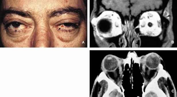 AMYLOIDOSIS Clinical features of orbital amyloidosis include proptosis and ocular motility disturbance and upper lid ptosis secondary to soft tissue infiltration322 (Fig. 36). The amyloid diseases are a diverse group of disorders, which can present as hereditary or sporadic forms. In these diseases, a hyaline material that is known as amyloid is deposited extracellularly in many tissues including fat, skeletal muscle, neural tissues, kidneys, adrenal glands, and, rarely, in the orbit.323 Orbital disease is manifested in most instances as a part of a systemic disorder such as multiple myeloma, rheumatoid arthritis, tuberculosis, etc.323,324 The most common types of amyloidosis are associated with multiple myeloma and primary amyloidoses. In plasma cell dyscrasias, a so-called protein AL is deposited in the affected tissues. In the primary amyloidosis, however, the deposited protein is known as AA, an amyloid derived from serum protein A and alpha-1 globulin. Both deposits AA and AP are insoluble, abnormal proteins and when they accumulate within the tissues, the normal architecture is distorted and thereby the tissue becomes dysfunctional. Under the light microscope the tissue deposits of amyloid appear as homogeneous, eosinophilic, hyaline material that stains orange/red with Congo-red technique and reveals a characteristic apple green birefringe under a polarizing filter. Amyloid deposits are also identified with crystal violet and thioflavin-T stains as well as with immunohistochemical stains that are specific for the AP and AA proteins.325 Ultrastructural examination reveals characteristic 6 to 10 nanometers branching fibrils arranged in a haphazard fashion without a distinct periodicity.326 In contrast with the systemic disease, focal amyloidosis in the orbit is a very rare disorder and may present as either a mass lesion or a diffuse infiltration involving fibroadipose tissues, lacrimal gland and/or extraocular muscles.327,328 The localized deposition of amyloid within the lacrimal gland presents with the enlargement of the gland, molding to adjacent structures and frequently with punctate calcification that is best depicted with CT.329 With MRI, amyloid deposits reveal low signal on T2-weighted images. With both CT and MRI, amyloid deposits demonstrate virtually no contrast enhancement with gadolinium.327 Extramedullary plasmacytomas occasionally may mimic amyloidosis when they are localized in the lacrimal and salivary glands.330 COLLAGEN TISSUE DISEASES Lupus erythematosus,331,332 dermatomyositis,333–335 rheumatoid arthritis,336,337 scleroderma,338–340 polyarteritis nodosa,342,343 angiolymphoid hyperplasia (Kimura disease),344–347 Behçet disease,348 and Churg-Strauss syndrome.349 are also known to involve orbit occasionally, and form diffuse and/or localized inflammation. ENOPHTHALMOS In great majority of orbital diseases, patients develop proptosis and displacement of the globe. It is important to remember, however, that in certain conditions the clinical presentation may be just the opposite, namely, the patient develops enophthalmos instead of exophthalmos.350,351 Enophthalmos (posterior/inferior dislocation of the globe) may occur with two basic mechanisms: structural abnormality, most commonly secondary to penetrating or nonpenetrating trauma with fractured orbital walls, and fibrosis of the orbital soft tissues, secondary to a number of pathological causes, including chronic inflammation, radiation degeneration, neoplasia, etc. The structural abnormality may also be related to a congenital malformation of the sphenoid bone in neurofibromatosis. If the bony defect is large enough, the globe may develop enophthalmos. Last but not least, orbital fibroadipose tissue may develop scarring and atrophy secondary to a number of diseases including scleroderma, radiation exposure, aging, and lipodystrophy.352 |