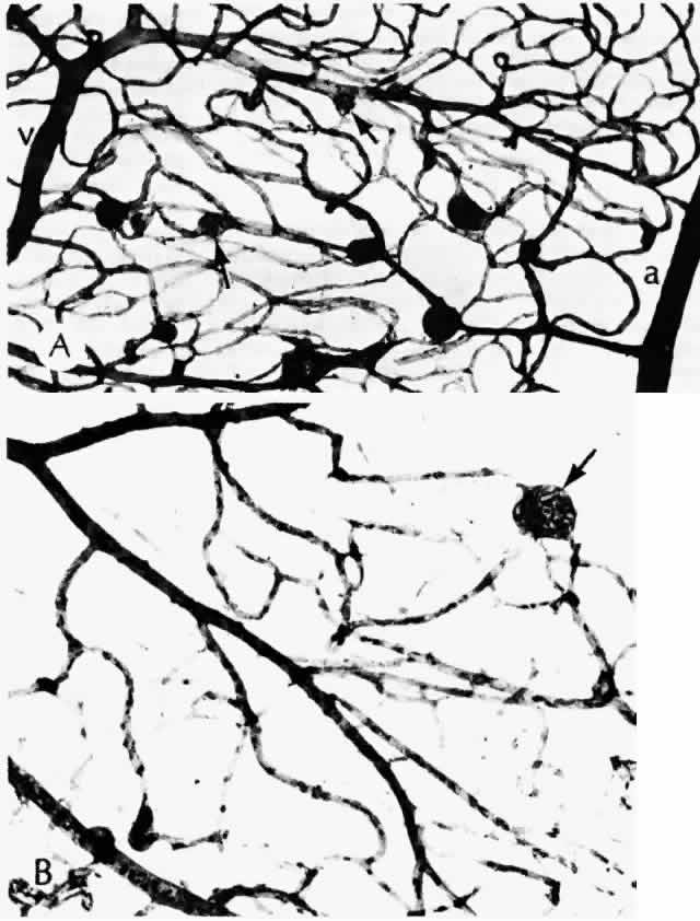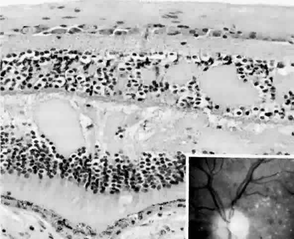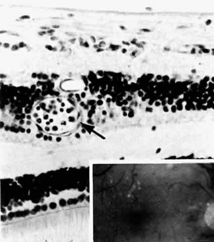 surface. In fact, it is not known what prompts the development of diabetic retinopathy, although ischemia clearly plays a role.25 Certain alterations have been observed in blood from diabetic patients, including increased rigidity and aggregation of the erythrocytes, altered platelet activity, changes in plasma proteins, and increased affinity of hemoglobin for oxygen. Both the increased aggregates of platelets and the abnormally rigid erythrocytes can occlude small blood vessels, contributing to retinal ischemia. The increased affinity of hemoglobin for oxygen means that less oxygen is released to the tissues.26 Whether tightly controlling blood sugar levels improves retinopathy or even halts its progression is controversial. In one investigation,27 dogs were made diabetic and put into three groups: good control for 5 years, poor control for 5 years, and poor control for 2½ years followed by good control for the remaining time. The third group had developed almost as many microaneurysms at 5 years as did the group under poor control for the entire time. This study indicates that tight control is maximally beneficial when undertaken early in the course of the disease. Human studies to corroborate or refute this have been understandably difficult to carry out. Transplantation of the pancreas or pancreatic islet cells is one way to normalize blood glucose by restoring endogenous insulin. In one study, eight patients who received pancreatic transplants exhibited no difference in retinopathy between the four whose transplants functioned and the four whose transplants failed.28 In another small study, the proliferative retinopathy of patients who received pancreatic transplants remained stable or worsened, despite their being euglycemic.29 Recently, results from a large prospective series, the Diabetes Control and Complications Trial, have shown that tight control, including three or more daily insulin injections or continuous infusion, based on at least four glucose determinations daily, does prevent development or progression of retinopathy to a significant degree. All patients in the primary prevention group had diabetes for 5 years or less and did not have retinopathy at the outset of the study. Thus, tight control begun early may indeed help prevent or delay the onset of retinopathy.30 As noted previously, duration of disease is a strong predictor for development of retinopathy.31,32 Prepubertal children may develop minimal retinopathy,33 but the blood-retinal barrier is altered during puberty, apparently through hormonal influence, leading to retinopathy.34 Unless the macula is edematous, nonproliferative retinopathy is asymptomatic and may be found only on routine ophthalmoscopy. In patients who develop diabetes after puberty, retinopathy may be a presenting sign of the disease. The earliest manifestation of diabetic retinopathy is the appearance of microaneurysms (Fig. 5, Color Fig. D). They appear as small red dots clinically and often are seen more readily on fluorescein angiography, where they fill and leak, with staining of the vessel wall.35 Histologically they are small “outpouchings” of the capillary vessel wall and are usually saccular but occasionally fusiform in shape. They can occur anywhere along the capillary network between the arteriole and venule.18 Some microaneurysms, however, do not fill with fluorescein and have been shown to be thin-walled capillary outpouchings filled with erythrocytes. They may represent either one stage of microaneurysm formation or a specific type of it.36 As shown by trypsin digestion, capillary pericytes are lost first,27 followed by endothelial cells (Figs. 6 and 7). Aldose reductase, one of the enzymes in the sorbitol metabolic pathway, is present in significant quantities in retinal capillary pericytes, but not in endothelial cells, and may thus be implicated in the formation of microaneurysms.37 The final result is an acellular segment of capillary that is nonperfused on fluorescein angiography.36 The normal retinal vasculature, including the capillaries, forms a barrier to the free exchange of metabolites.38 This blood-retinal barrier is damaged in diabetes, allowing leakage of larger molecules, which are clinically manifested as hard exudates and retinal edema. Ultrastructurally, the normal junctions between capillary endothelial cells are disrupted.39 Hard exudates clinically appear as shiny yellow deposits (see Fig. 5; Color Fig. D). When they surround a microaneurysm in a circular pattern, the condition is called circinate retinopathy. Histologically, the deposits accumulate at the level of the outer plexiform layer (Fig. 8, Color Fig. E) and consist of lipids, complex carbohydrates, and proteins, as demonstrated histochemically. Hard exudates are normally asymptomatic unless they involve the macula, where they cause a drop in visual acuity. If a leaking microaneurysm can be identified on fluorescein angiography, laser photocoagulation can obliterate it. Over time, the fluid is resorbed, and sometimes visual acuity can improve.40 Cystoid macular edema can be caused by many different diseases as well as diabetes. It is characterized by diffuse leakage of the capillaries in the posterior pole. In advanced cases, the cystoid spaces are ophthalmoscopically visible, resembling the petals of a flower. Cystoid edema is seen more easily on fluorescein angiography, since the spaces fill with fluorescein. Histologically, cystoid fluid is seen at the outer plexiform layer, but may also accumulate in the inner nuclear layer. The synapses of the outer plexiform layer are slanted in the fovea because the inner retinal layers are pushed away from the foveal pit. Because of these slanted connections, this area can be distended by fluid more readily. Ultrastructurally, the fluid appears to be located within Müller cells, and there is evidence of capillary endothelial damage.41 In some patients, the cystoid spaces can coalesce, forming lamellar