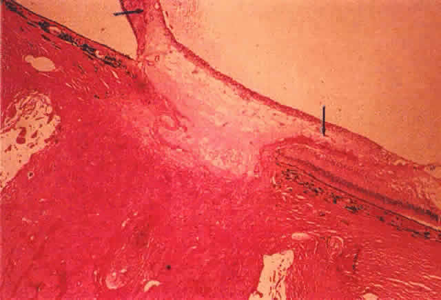 to death,19 whereas others have been less convinced of such a relationship.20 See Color Plate 1 for Color Figs. A through G These glycogen vacuoles can rupture when the intraocular pressure is suddenly reduced, resulting in a cloud of pigment granules carried anteriorly in the aqueous fluid. This pigment may then be phagocytosed by the corneal endothelium. The pupils of patients with diabetes often dilate poorly, and the amount of glycogen in the pigment epithelium may correlate to damage to the dilator muscle. Rubeosis iridis is a clinical term for the reddish discoloration imparted by neovascularization of the iris surface. It is associated most frequently with retinal ischemia and neovascularization, and indicates the presence of a diffusible vascular proliferative factor secreted by the retina.21 Initially, the vessels can be quite difficult to see. With more advanced rubeosis, there may be ectropion uveae, an eversion of the posterior iris surface at the pupil margin. The earliest location of the new vessels has been a matter of longstanding debate. They appear at the pupil margin and in the angle virtually simultaneously, subsequently spreading across the iris surface, but gonioscopic examination is required for the vessels to be seen in the angle. In some patients, the vessels do form in the angle before being perceptible at the pupil margin.22 Peripheral anterior synechiae form rapidly after neovascularization of the iris, closing off the trabecular meshwork and giving rise to so-called neovascular glaucoma, which is difficult to treat. In addition, the vessels and associated fibrous tissue can proliferate across the pupil, sequestering it. Particularly in aphakic patients, the vessels can also extend through the pupil and onto the posterior iris surface. Histologically the new vessels are located anterior to the anterior border layer of the iris (Fig. 3, Color Fig. B). They are thin-walled, unlike the normal thick-walled iris stromal vessels. New vessels may be located only at the pupillary margin and in the angle at the iris root, corroborating the clinical finding.18 Scanning electron microscopy has disclosed a thin, transparent layer of myofibroblastic proliferation anterior to the new vessels. This explains the clinical observation that the anterior iris surface appears smoothed out, with loss of the collarette and crypts typically seen on the normal iris surface. Myofibroblasts have contractile properties and thus may be responsible for the angle closure of neovascular glaucoma and also for the eversion of the posterior iris surface at the pupillary margin (Color Fig. C).23 |