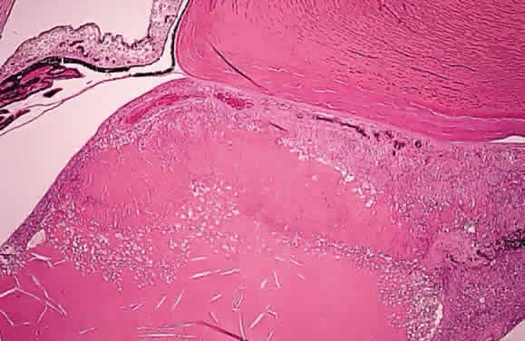 Coats' disease usually is unilateral, and two thirds of cases occur in boys. Although most cases are diagnosed in the second half of the first decade (age 4 to 10 years), the disease can affect children between 18 months and 18 years. Macroscopically, enucleated eyes with Coats' disease have a high bullous retinal detachment that typically abuts the back surface of the lens and ciliary body (see Fig. 22). The lens-iris diaphragm is displaced anteriorly, causing secondary closed-angle glaucoma via a pupillary block mechanism. The yellow, gelatinous subretinal fluid contains glistening crystals of cholesterol. Rarely, the lipid-rich subretinal fluid enters the anterior chamber through defects in the retina and anterior vitreous. Histopathologically, parts of the inner retina contain an increased number of large telangiectatic vessels. The outer retinal layers are massively thickened by exudates, which appear as pools of eosinophilic and transudate positive for periodic acid-Schiff (see Fig. 23). The densely proteinaceous and lipid-rich subretinal fluid contains aggregates of foamy histiocytes and empty clefts that contained free, rhomboidal, crystals of cholesterol that were dissolved by lipid solvents during processing (see Fig. 24). RETINOPATHY OF PREMATURITY Organization or fibrosis of the vitreous (e.g., cyclitic membrane formation), which may lead to tractional retinal detachment, occurs in several conditions that simulate retinoblastoma, including retinopathy of prematurity (ROP). The term retrolental fibroplasia, originally applied to this largely iatrogenic disorder, emphasizes the causal role of vitreous organization in the tractional retinal detachment that complicates its final stages. ROP usually is bilateral and rarely is present at birth, two features it shares with retinoblastoma. Classically, ROP develops in premature infants who have received supplemental oxygen therapy. Infants weighing less than 1500 g at birth and those born at a gestational age of less than 32 weeks are at risk for developing ROP. However, occasional cases have been reported in full-term infants and in premature infants who did not receive oxygen therapy. Vascular proliferation and secondary vitreous fibrosis are thought to result from the effect of increased oxygen levels on the immature, incompletely vascularized retina. ROP typically arises in the temporal quadrant of the retina, because the temporal retina usually is not completely vascularized at term, especially in premature infants. Experiments performed in newborn kittens suggest that excessive oxygen induces transient vasoconstriction, subsequent dilatation, and ultimately vaso-obliteration of immature retinal vessels. Electron microscopic studies suggest that retinal neovascularization in the human may be a response of the vanguard of primitive, vasoformative spindle cells in the nonvascularized peripheral retina to elevated oxygen levels or, perhaps, diminished levels of vitamin E. Increased numbers of intercellular gap junctions between vasoformative cells have been observed in vitamin E-deficient infants who subsequently developed ROP. The role of this natural antioxidant compound in the causation and therapy of ROP remains controversial. In the early active stages of ROP, a band of glomeruloid capillaries proliferates at the junction between the peripheral nonperfused and the posterior perfused retina. The proliferating vessels break through the internal limiting membrane and invade the vitreous, inciting fibrosis and contraction. In the later cicatricial stages of ROP, the retina is folded on itself by the organized vitreous, forming a fibroneural mass that drags the macula and optic disc temporally (Fig. 25). The end stage of the disease is marked by total retinal detachment, leukocoria, blindness, and phthisis bulbi. RETINAL DETACHMENT Retinal detachment in childhood can be confused with retinoblastoma, and vice versa. The possibility of an underlying retinoblastoma should always be considered when a child presents with retinal detachment and vitreous hemorrhage, even when a history of trauma is obtained. Appropriate preoperative studies (ultrasonography or computed tomography) are indicated; if vitrectomy is performed, the specimen should be submitted for cytologic examination. The clinician must recall that retinoblastoma occasionally presents in older children, who may have the diffuse infiltrative form of the tumor that typically does not cause a discrete tumefaction or leukocoria. In addition, retinoblastoma (or another intraocular malignancy such as medulloepithelioma) must be ruled out in any infant or child with neovascular glaucoma. Neovascular glaucoma in a child is retinoblastoma until proven otherwise. In addition, the ophthalmologist always should recall the association between retinal detachment and child abuse. INCONTINENTIA PIGMENTI Peripheral vascular abnormalities, which are believed to cause secondary retinal detachment and leukocoria, occur in females who have incontinentia pigmenti or the Bloch-Sulzberger syndrome. This rare multisystem disorder has an X-linked dominant inheritance; normal males die in utero, but the disorder has been reported in males with Klinefelter's syndrome (XXY). Affected female infants develop vesiculobullous skin lesions on the trunk and extremities at birth or shortly thereafter. The bullae contain many eosinophils, and systemic eosinophilia is often present. The term incontinentia pigmenti refers to the incontinence, or loss, of melanin from epidermal basal cells. The pigment collects in the dermis as free granules or as aggregates of melanophages. Clinically, the affected skin has a characteristic marbleized or whorllike pattern of pigmentation. Other manifestations of the syndrome include alopecia, dental anomalies (late dentition, absent or misshapen teeth), and central nervous system abnormalities (seizures, mental retardation). Ocular findings occur in approximately one third of pat