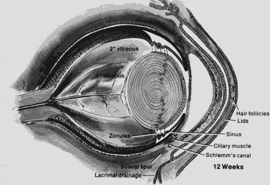 Abnormalities of the lens that occur during the stage of differentiation include alterations in size (e.g., microspherophakia), in shape (e.g., anterior and posterior lenticonus), and in the lens fibers themselves (e.g., developmental cataracts). The developing lens receives its blood supply from multiple branches of the hyaloid artery. These cover the anterior and posterior aspect of the lens and anastomose with vessels within the mesenchyme tissue that covers the lens, forming the pupillary membrane. This hyaloidal vascular system is called the tunica vasculosa lentis. Its greatest development occurs at 9 weeks' gestation, starts to regress by the end of the third month, and is usually complete by the eighth month. Failure of this system to regress leads to a persistent pupillary membrane. Mittendorf's dot is also a failure of complete regression and represents that part of the hyaloid artery that attached to the posterior lens capsule. RETINAL DIFFERENTIATION When the optic vesicle collapses, the neural ectoderm folds onto itself to produce the optic cup, which has a double layer of neural ectoderm. The optic cup will differentiate into the neurosensory retina (inner layer of neural ectoderm) and retinal pigment epithelium (outer layer). Further development of the sensory retina may be divided into four stages of progressive differentiation: the initial differentiation into zones, the organization into temporary layers, the migration and differentiation of cells, and the final organization of layers. Disorganized differentiation may result in the histologic picture of retinal dysplasia.7 VITREOUS DIFFERENTIATION The primary vitreous forms between the inner layer of the optic cup and the developing lens at approximately 6 weeks. The secondary vitreous is derived from the retina and surrounds the primary vitreous. It is composed of very fine, densely packed fibrils that are arranged in an orderly manner at right angles to the retinal surface. Condensation of the fibrils forms the walls of the canal of Cloquet, which is a conduit for the hyaloid artery. The hyaloid artery supplies the vascular network surrounding the lens. At the end of the third month, the hyaloid artery atrophies and retracts with the primary vitreous to form a narrow and constricted zone in the central vitreous cavity (Figs. 2 and 3). The atrophy begins centrally and proceeds anteriorly and posteriorly. Incomplete atrophy may result in anterior hyaloid remnants associated with the lens or in posterior remnants associated with the optic nerve head. An example of an anterior remnant is Mittendorf's dot. Bergmeister's papilla may be considered a posterior remnant of the hyaloid system.